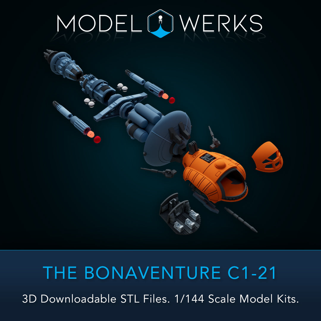 The Bonaventure C1-21 3D printable is multipart, in 1/144 scale (estimated). It has a full cockpit interior and is roughly 17 inches long when assembled. The kit features two base options and a printable PDF decal sheet.