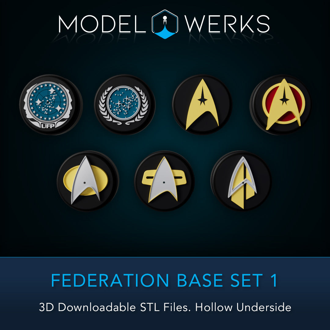 This is a collection of 7 bases for Federation Models. All bases are hollow underneath and large enough to conceal a battery pack for those who light their models. here is a 3mm hole for a metal rod mount in the center of each base.
